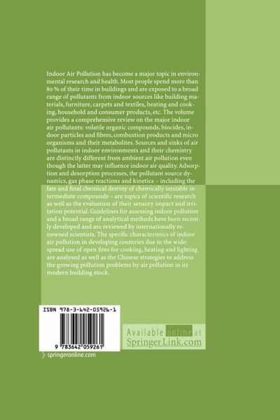 Indoor Air Pollution has become a major topic in environmental research and health. Most people spend more than 80% of their time in buildings and are exposed to a broad range of pollutants from indoor sources such as building materials, furniture, carpets and textiles, heating and cooking, household and consumer products, etc. The volume provides a comprehensive review of the major indoor air pollutants: volatile organic compounds, biocides, indoor particles and fibres, combustion products and micro-organisms and their metabolites. Sources and sinks of air pollutants in indoor environments and their chemistry are distinctly different from ambient air pollution, even though the latter may influence indoor air quality. Adsorption and desorption processes, the pollutant source dynamics, gas phase reactions and kinetics - including the fate and final chemical destiny of chemically unstable intermediate compounds - are topics of scientific research as well as the evaluation of their sensory impact and irritation potential. Guidelines for assessing indoor pollution and a broad range of analytical methods have been recently developed and are reviewed by internationally renowned scientists. The specific characteristics of indoor air pollution in developing countries due to the widespread use of open fires for cooking, heating and lighting are analysed as well as the Chinese strategies to address the growing pollution problems by air pollution in its modern building stock.