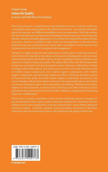 Written by a highly recognized and experienced medical expert in the field, the book starts with an introduction to the indoor environment, including topics such as indoor environmental quality and health, indoor climate, sampling of indoor pollutants, and measures to improve indoor air quality. The author then delves into the fundamentals of exposure assessment and special exposure indoor situations, followed by in-depth coverage of the health aspects, and indoor air occurrence of several substances such as volatile organic compounds, very volatile organic compounds, semi-volatile organic compounds, and particulate matters and fibers. Particular attention is given to bioaerosols like mold, microbial volatile organic compounds, mycotoxins, and viruses. Readers will also find chapters devoted to the main health aspects and indoor occurrence of inorganic gases, radon and metals, and smoking. The book closes with a chapter on risk assessment, in which readers will learn more about the basics of risk assessment, key points and processes of a health evaluation, and guidance for assessing indoor air contamination.