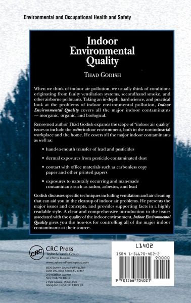Taking an in-depth and "hard science" look at the problems of indoor environmental pollution, renowned author Thad Godish discusses all the major indoor contaminants - inorganic, organic, and biological. He covers specific techniques including ventilation and air cleaning that can aid professionals in the clean-up of indoor air problems.