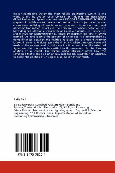 Indoor positioning System-The most reliable positioning System in the world to find the position of an object in an Indoor environment where Global Positioning System does not work.INDOOR POSITIONING SYSTEM is a system in which we can locate the position of an object in an indoor environment utilizing ultrasonic waves generated by narrow directional ultrasonic transmitter. To achieve the objective of position detection, we have designed ultrasonic transmitter and receiver circuits, RF transmitter, and receiver for synchronization purposes. By implementing time of arrival method, we have located the position of an object. It is accomplished by using distances between the multiple receivers and a single transmitter located in a room. RF signal starts the timer and when ultrasonic waves will reach at the receiver end, it will stop the timer and then the extracted signal from the receiver is transmitted to the microcontroller for locating position of an object. The systems using ultrasonic waves have the advantage that it can be built on low cost and has relatively high accuracy to detect the position of an object in an indoor environment.
