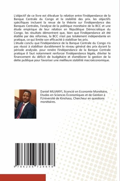 L'objectif de ce livre est d'évaluer la relation entre l'indépendance de la Banque Centrale du Congo et la stabilité des prix. les objectifs spécifiques incluent la revue de la théorie sur l'indépendance des Banques Centrales, l'analyse de la politique monétaire de la BCC et une étude empirique de leur relation en République Démocratique du Congo. les résultats démontrent que, bien que l'indépendance ait été établie par des réformes, la BCC n'est pas totalement indépendante en pratique, ce qui limite son efficacité à stabiliser les prix. L'étude conclu que l'indépendance de la Banque Centrale du Congo n'a pas réussi à stabiliser durablement le niveau général des prix durant la période analysée. pour rendre l'indépendance de la Banque Centrale pratique il faut notamment renforcer l'indépendance légale, d'éviter le financement du déficit de budgétaire et d'améliorer la gestion de la dette publique pour favoriser une meilleure stabilité macroéconomique.