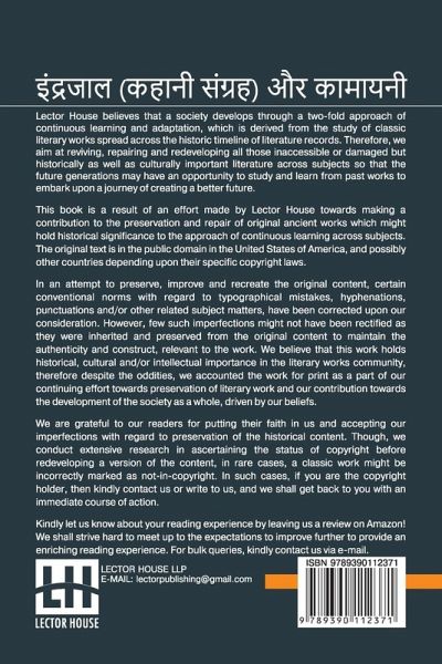 Indrajaal (Kahani Sangraha) Aur Kamayani This book is a result of an effort made by us towards making a contribution to the preservation and repair of original classic literature. In an attempt to preserve, improve and recreate the original content, we have worked towards: 1. Type-setting & Reformatting: The complete work has been re-designed via professional layout, formatting and type-setting tools to re-create the same edition with rich typography, graphics, high quality images, and table elements, giving our readers the feel of holding a 'fresh and newly' reprinted and/or revised edition, as opposed to other scanned & printed (Optical Character Recognition - OCR) reproductions. 2. Correction of imperfections: As the work was re-created from the scratch, therefore, it was vetted to rectify certain conventional norms with regard to typographical mistakes, hyphenations, punctuations, blurred images, missing content/pages, and/or other related subject matters, upon our consideration. Every attempt was made to rectify the imperfections related to omitted constructs in the original edition via other references. However, a few of such imperfections which could not be rectified due to intentional\unintentional omission of content in the original edition, were inherited and preserved from the original work to maintain the authenticity and construct, relevant to the work. We believe that this work holds historical, cultural and/or intellectual importance in the literary works community, therefore despite the oddities, we accounted the work for print as a part of our continuing effort towards preservation of literary work and our contribution towards the development of the society as a whole, driven by our beliefs. We are grateful to our readers for putting their faith in us and accepting our imperfections with regard to preservation of the historical content. HAPPY READING!