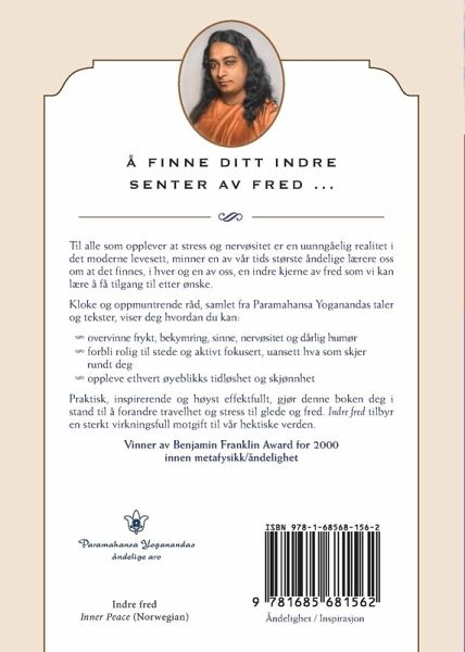 Til alle som opplever at stress og nervøsitet er en uunngåelig realitet i det moderne levesett, minner en av vår tids største åndelige lærere oss om at det finnes, i hver og en av oss, en indre kjerne av fred som vi kan lære å få tilgang til etter ønske. Kloke og oppmuntrende råd, samlet fra Paramahansa Yoganandas taler og tekster, viser deg hvordan du kan: -overvinne frykt, bekymring, sinne, nervøsitet og dårlig humør -forbli rolig til stede og aktivt fokusert, uansett hva som skjer rundt deg -oppleve ethvert øyeblikks tidløshet og skjønnhet Praktisk, inspirerende og høyst effektfullt, gjør denne boken deg i stand til å forandre travelhet og stress til glede og fred. Indre fred tilbyr en sterkt virkningsfull motgift til vår hektiske verden.