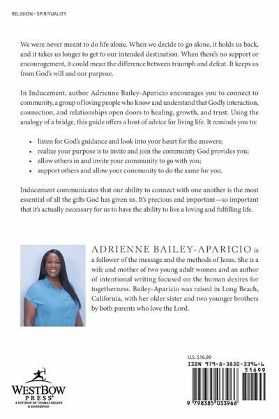 We were never meant to do life alone. When we decide to go alone, it holds us back, and it takes us longer to get to our intended destination. When there's no support or encouragement, it could mean the difference between triumph and defeat. It keeps us from God's will and our purpose. In Inducement, author Adrienne Bailey-Aparicio encourages you to connect to community, a group of loving people who know and understand that Godly interaction, connection, and relationships open doors to healing, growth, and trust. Using the analogy of a bridge, this guide offers a host of advice for living life. It reminds you to: ¿ listen for God's guidance and look into your heart for the answers; ¿ realize your purpose is to invite and join the community God provides you; ¿ allow others in and invite your community to go with you; ¿ support others and allow your community to do the same for you. Inducement communicates that our ability to connect with one another is the most essential of all the gifts God has given us. It's precious and important-so important that it's actually necessary for us to have the ability to live a loving and fulfilling life.