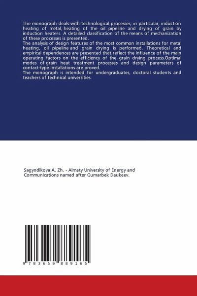 The monograph deals with technological processes, in particular, induction heating of metal, heating of the oil pipeline and drying of grain by induction heaters. A detailed classification of the means of mechanization of these processes is presented.The analysis of design features of the most common installations for metal heating, oil pipeline and grain drying is performed. Theoretical and empirical dependences are presented that reflect the influence of the main operating factors on the efficiency of the grain drying process.Optimal modes of grain heat treatment processes and design parameters of contact-type installations are proved.The monograph is intended for undergraduates, doctoral students and teachers of technical universities.
