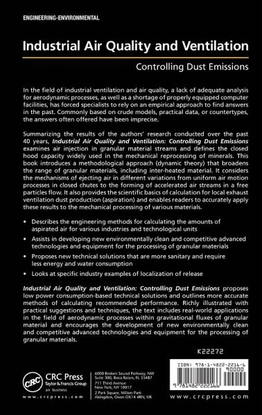 In the field of industrial ventilation and air quality, a lack of adequate analysis for aerodynamic processes, as well as a shortage of properly equipped computer facilities, has forced specialists to rely on an empirical approach to find answers in the past. Commonly based on crude models, practical data, or countertypes, the answers often offered have been imprecise. Summarizing the results of the authors' research conducted over the past 40 years, Industrial Air Quality and Ventilation: Controlling Dust Emissions examines air injection in granular material streams and defines the closed hood capacity widely used in the mechanical reprocessing of minerals. This book introduces a methodological approach (dynamic theory) that broadens the range of granular materials, including inter-heated material. It considers the mechanisms of ejecting air in different variations from uniform air motion processes in closed chutes to the forming of accelerated air streams in a free particles flow. It also provides the scientific basics of calculation for local exhaust ventilation dust production (aspiration), and enables readers to accurately apply these results to the mechanical processing of various materials. ¿ Describes the engineering methods for calculating the amounts of aspirated air for various industries and technological units ¿ Assists in developing new environmentally clean and competitive advanced technologies and equipment for the processing of granular materials ¿ Proposes new technical solutions that are more sanitary and require less energy and water consumption ¿ Looks at specific industry examples of localization of release Industrial Air Quality and Ventilation: Controlling Dust Emissions proposes low power consumption-based technical solutions and outlines more accurate methods of calculating recommended performance. Richly illustrated with practical suggestions and techniques, the text includes real-world applications in the field of aerodynamic processes within gravitational fluxes of granular material, and encourages the development of new environmentally clean and competitive advanced technologies and equipment for the processing of granular materials.