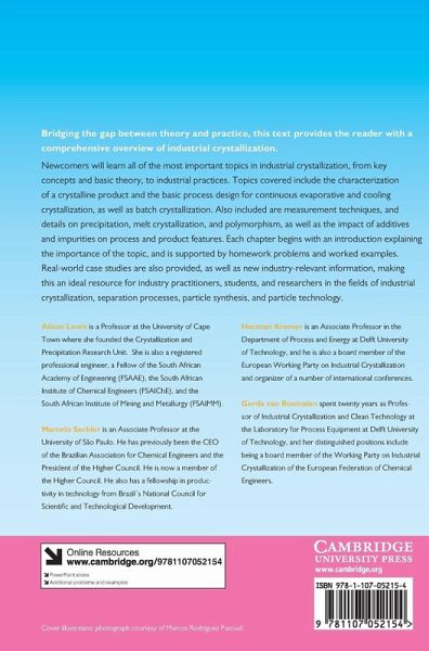 Bridging the gap between theory and practice, this text provides the reader with a comprehensive overview of industrial crystallization. Newcomers will learn all of the most important topics in industrial crystallization, from key concepts and basic theory to industrial practices. Topics covered include the characterization of a crystalline product and the basic process design for crystallization, as well as batch crystallization, measurement techniques, and details on precipitation, melt crystallization and polymorphism. Each chapter begins with an introduction explaining the importance of the topic, and is supported by homework problems and worked examples. Real world case studies are also provided, as well as new industry-relevant information, making this is an ideal resource for industry practitioners, students, and researchers in the fields of industrial crystallization, separation processes, particle synthesis, and particle technology.