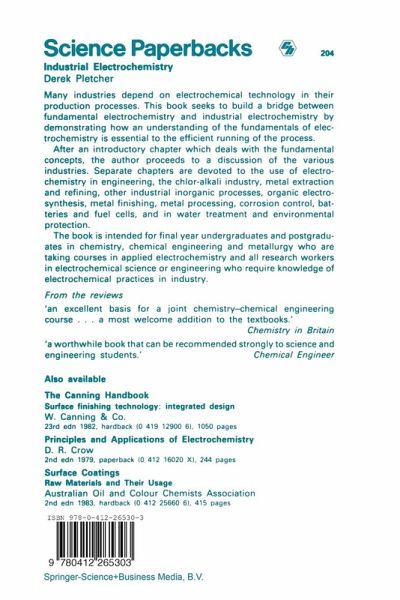 Electrochemistry is clearly an important component of the technology of many quite diverseindustries. Moreover, the future for electrochemical technology is bright and there is a general expectation that new applications of electrochemistry will become economic as the world responds to the challenge of more expensive energy, of the need to develop new materials and to exploit different chemical feedstocks and of the necessity to protect the environment. " Inthis situation, the present rather fragmentary state ofelectrochemical technology is disappointing. Whilethere are many similarities in the underlying principles and even the practices of the electrochemically based industries, they are often not fully appreciated. Certainly, the Rand D programmes in many industries are in the hands of those with little formal training and whose experience of and interest in other branches of electrochemistry is very limited. Moreover, the academic world has done little to help. Electrode processes are, too often, totally ignored in courses to both scientists and engineers and certainly electrochemical technology is almost never taught as a unified subject with an appropriate balance between fundamentals, engineering and applications. Overall, it isnot surprising that the various strands have not interwoven and that scientists and engineers do not have a proper appreciation of the importance of electrochemical technology. Inthe first half of 1979 I conducted a survey into the research and development needs of the various industries in Britain using electrochemical technology.