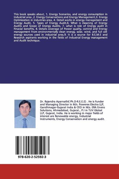 This book speaks about, 1. Energy Scenarios, and energy consumption in Industrial area ,2. Energy Conservations and Energy Management,3. Energy Optimization in industries area, 4. Detail works in energy management and Energy Audit, 5. Types of Energy Audit,6. What is meaning of Energy Audits and Scope of Energy Audits, 7. what is role of Energy audit in Finacial benefits, 8. Details coverage of Power quality, control and Energy management from environmentally clean energy, solar, wind, and full cell energy sources used in industrial area,9. It is a source for B.E,M.E and Research aspirants working in the fields of Industrial Energy management and Audit technique.