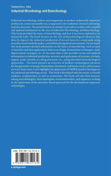 1 Understanding the small world: The Microbes.- 2 Bacteria and their industrial importance.- 3 Industrial perspectives of fungi.- 4 Microbial fermentation: basic fundamentals and its dynamic prospect in various industrial applications.- 5 Fermenter Design.- 6 Strain improvement of microbes.- 7 Enzyme Kinetics: a plethora of information.- 8 Asparaginase: Production, harvest, recovery and potential industrial application.- 9 Laccases: production, harvest, recovery, and potential industrial application.- 10 Pectinases: Production, harvest, recovery, and potential industrial application.- 11 Production of malt-based beverages.- 12 Biotransformation of industrially important steroid drug precursors.- 13 Value addition to chemical compounds through biotransformation.- 14 Fermentation Strategies for Organic Acid Production.- 15 Biological Production of Succinic Acid: State of the Art and Future Perspectives.- 16 Biomass, Bioenergy, and Biofuels.- 17 Biomethanation: Advancements for Upgrading Biomethane in Biogas Technologies.- 18 Microbial Bioelectricity Generation & Product Electrosynthesis.- 19 Microbial assisted systems for lignin-based product generation.- 20 Bioremediation Technology : A cumulative study of Microbial bioremediation of heavy metals, aromatic hydrocarbons, acrylamide and polyacrylamide.- 21 Microbes and their application in the food and agriculture industry.- 22 Microbes in resource and nutrient recovery via wastewater treatment.- 23 Potential of CRISPR/Cas9-based genome editing in the fields of industrial biotechnology-strategies, challenges, and applications.- 24 Animal cell culture: Basics and applications.