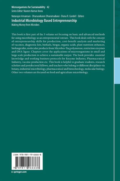1.Microbiology Based Entrepreneurship.- 2. Mass multiplication, production cost analysis and marketing of protease.- 3. Mass multiplication, production cost analysis and marketing of xylanase.- 4. Mass multiplication, production cost analysis and marketing of cellulase.- 5. Mass multiplication, production cost analysis and marketing of pectinase.- 6. Production, cost analysis, and marketing of Citric acid.- 7. Production, cost analysis and Marketing of Lactic acid.- 8. Production, cost analysis and marketing of acetic acid (vinegar).- 9. Mass Multiplication, Production Cost Analysis and Marketing of Polyhydroxyalkanoates (PHAs).- 10. Small, large-scale production and cost-benefit analysis and marketing of agar from Gelidium.- 11. Mass production of valuable pro-vitamin A pigment from a microbe, cost analysis and targeting it for health benefiting purpose.- 12. Pseudomonas species derived chitinase mass multiplication, production cost analysis, and marketing: as a biocontrol agent for crop protection.- 13. Production, cost analysis and marketing of Bio-organic Liquid Fertilizers and Plant Nutrition Enhancer.- 14. Production, cost analysis and marketing of agricultural effective microorganisms.- 15. Production, cost analysis and marketing of biogas.- 16. Mass Production and Marketing of Compost Caterpillar Fungus Cordyceps sinensis.- 17. Mass Production Methods, Market and Applications of Chitosan & Chitin Oligomer as a Biostimulant.- 18. Mass Multiplication and Production Cost Analysis and Marketing of Phosphate Solubilizing Microorganisms (PSM).- 19. Large scale production and Business plan for Novel Corona Vaccine.