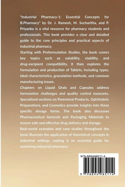 "Industrial Pharmacy-1: Essential Concepts for B.Pharmacy" by Dr. J. Ramesh, M. Sucharitha, and P. Priyanka is a vital resource for pharmacy students and professionals. This book provides a clear and detailed guide to the core principles and practical aspects of industrial pharmacy. Starting with Preformulation Studies, the book covers key topics such as solubility, stability, and drug-excipient compatibility. It then explores the formulation and production of Tablets, including types, ideal characteristics, granulation methods, and common manufacturing issues. Chapters on Liquid Orals and Capsules address formulation challenges and quality control measures. Specialized sections on Parenteral Products, Ophthalmic Preparations, and Cosmetics provide insights into these specific dosage forms. The book also discusses Pharmaceutical Aerosols and Packaging Materials to ensure safe and effective drug delivery and storage. Real-world examples and case studies throughout the book illustrate the application of theoretical concepts in industrial settings, making it an essential guide for mastering industrial pharmacy.