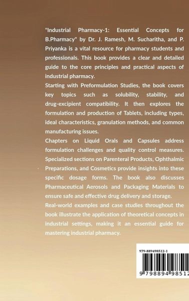 "Industrial Pharmacy-1: Essential Concepts for B.Pharmacy" by Dr. J. Ramesh, M. Sucharitha, and P. Priyanka is a vital resource for pharmacy students and professionals. This book provides a clear and detailed guide to the core principles and practical aspects of industrial pharmacy. Starting with Preformulation Studies, the book covers key topics such as solubility, stability, and drug-excipient compatibility. It then explores the formulation and production of Tablets, including types, ideal characteristics, granulation methods, and common manufacturing issues. Chapters on Liquid Orals and Capsules address formulation challenges and quality control measures. Specialized sections on Parenteral Products, Ophthalmic Preparations, and Cosmetics provide insights into these specific dosage forms. The book also discusses Pharmaceutical Aerosols and Packaging Materials to ensure safe and effective drug delivery and storage. Real-world examples and case studies throughout the book illustrate the application of theoretical concepts in industrial settings, making it an essential guide for mastering industrial pharmacy.