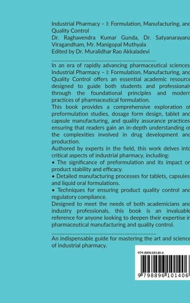 Industrial Pharmacy - I: Formulation, Manufacturing, and Quality Control This comprehensive text, Industrial Pharmacy - I: Formulation, Manufacturing, and Quality Control, is an essential resource for understanding the principles, techniques, and regulatory aspects of pharmaceutical production. Written by renowned experts in the field, it serves as both a foundational text for students and a practical guide for professionals. The book delves into key areas such as preformulation studies, tablet and capsule manufacturing, parenteral product development, and the critical quality control processes that ensure the safety and efficacy of pharmaceutical products. With clear explanations, practical insights, and a strong focus on Good Manufacturing Practices (GMP), this work provides readers with the knowledge needed to meet the challenges of modern pharmaceutical manufacturing. Industrial Pharmacy - I is structured to meet academic and industrial standards, making it an indispensable reference for students, researchers, and industry professionals alike. Whether you are learning the basics or advancing your expertise, this book will help you navigate the complexities of drug formulation and quality assurance. Master the science and technology behind pharmaceutical manufacturing. Prepare for a successful career in the pharmaceutical industry with expert guidance on formulation and quality control.