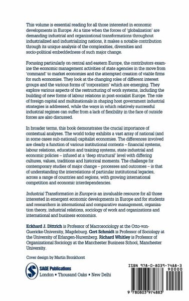 PART ONE: INTRODUCTION Europe in Flux - Gert Schmidt Change in East and West Transformation and Change in Europe - Richard Whitley Critical Themes PART TWO: PATTERNS OF INDUSTRIAL TRANSFORMATION IN EUROPE: INSTITUTIONAL CONTEXTS Introduction - Gert Schmidt The Elegance of Incoherence - Gernot Grabher Economic Transformation in East Germany and Hungary From Privatization to Capitalization - Christian von Hirschhausen Industrial Restructuring in Post-Socialist Central and Eastern Europe Contention and Confusion in Industrial Transformation - Jeffrey Henderson, Richard Whitley, Gyorgy Lengyel and Laszlo Czaban Dilemmas of State Economic Management Organizing Markets in Central and Eastern Europe - Hugo Radice Competition, Governance and the Role of Foreign Capital PART THREE: REGULATION OF INTERESTS: CONTINUITY AND CHANGE Introduction - Gert Schmidt Labour Relations in the Making - Eckhard J Dittrich and Michael Haferkemper Bulgaria, Hungary, Poland and the Czech Republic Towards Corporatism? The Transformation of Interest Policy and Interest Regulation in Eastern Europe - Melanie Tatur PART FOUR: WORK RESTRUCTURING IN EAST AND WEST: LIMITS AND DIRECTIONS Introduction - Gert Schmidt Skilled Work in Contemporary Europe - Roger Penn and David Sleightholme A Journey into the Dark The Region of Baden-W[um]urttemberg - Hans-Joachim Braczyk, Gerd Schienstock and Bernard Steffensen A Post Fordist Success Story? Enterprise Transformation and the Redefinition of Organizational Realities in Poland - Krzysztof Konecki and Jolanta Kulpi[ac]nska Employment Relations in Multinational Companies - Csaba Mak[ac]o and P[ac]eter Novosz[ac]ath The Hungarian Case
