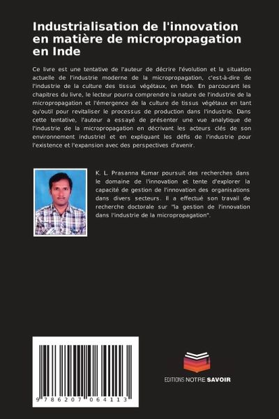 Ce livre est une tentative de l'auteur de décrire l'évolution et la situation actuelle de l'industrie moderne de la micropropagation, c'est-à-dire de l'industrie de la culture des tissus végétaux, en Inde. En parcourant les chapitres du livre, le lecteur pourra comprendre la nature de l'industrie de la micropropagation et l'émergence de la culture de tissus végétaux en tant qu'outil pour revitaliser le processus de production dans l'industrie. Dans cette tentative, l'auteur a essayé de présenter une vue analytique de l'industrie de la micropropagation en décrivant les acteurs clés de son environnement industriel et en expliquant les défis de l'industrie pour l'existence et l'expansion avec des perspectives d'avenir.