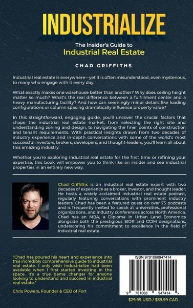 The Ultimate Guide to Industrial Real Estate Whether you're a seasoned investor, a curious newcomer, or a real estate pro looking to sharpen your edge, this book is your definitive roadmap to the industrial property world. From factories and warehouses to cranes, racking, and everything in between, you'll get a comprehensive breakdown of the spaces that keep the global economy running. Packed with insights on manufacturing, logistics, site selection, architecture, construction, legal considerations, and even forklifts and floor drains-this isn't theory. It's boots-on-the-ground knowledge you can actually use. You'll learn:What makes industrial real estate unique How global trade and local zoning collide The nuts and bolts of loading docks, ceiling heights, power supply, and more The real risks-and rewards-of investing or operating in the space How the rise of e-commerce, reshoring, and supply chain shifts are changing everything Smart, straightforward, and sometimes a little funny-this book brings clarity to a complex asset class that's often overlooked but always essential. Welcome to the most important real estate in the world.