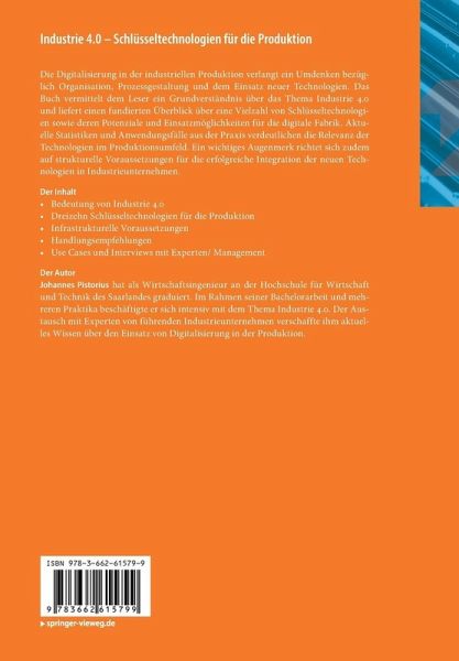 Die Digitalisierung in der industriellen Produktion verlangt ein Umdenken bezüglich Organisation, Prozessgestaltung und dem Einsatz neuer Technologien. Das Buch vermittelt dem Leser ein Grundverständnis über das Thema Industrie 4.0 und liefert einen fundierten Überblick über eine Vielzahl von Schlüsseltechnologien sowie deren Potenziale und Einsatzmöglichkeiten für die digitale Fabrik. Aktuelle Statistiken und Anwendungsfälle aus der Praxis verdeutlichen die Relevanz der Technologien im Produktionsumfeld. Ein wichtiges Augenmerk richtet sich zudem auf strukturelle Voraussetzungen für die erfolgreiche Integration der neuen Technologien in Industrieunternehmen.