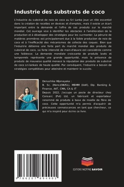 L'industrie du substrat de noix de coco au Sri Lanka joue un rôle essentiel dans la création de recettes en devises et d'emplois, mais il existe un écart important entre la demande et l'offre de ces produits sur le marché mondial. Cet ouvrage vise à identifier les obstacles à l'amélioration de la production et à développer des stratégies pour les surmonter. La pénurie de matières premières est principalement due à la faible production de noix de coco et à l'inefficacité des mécanismes de collecte des coques. Bien que l'industrie détienne une forte part du marché mondial des produits de substrat de coco, sa forte intensité de main-d'oeuvre est considérée comme une faiblesse. La demande mondiale croissante de produits lavés et tamponnés représente une grande opportunité, mais la présence de produits de mauvaise qualité menace la réputation des produits de substrat de coco sri-lankais de haute qualité. Par conséquent, l'industrie a besoin de stratégies compétitives pour atteindre et maintenir le succès.
