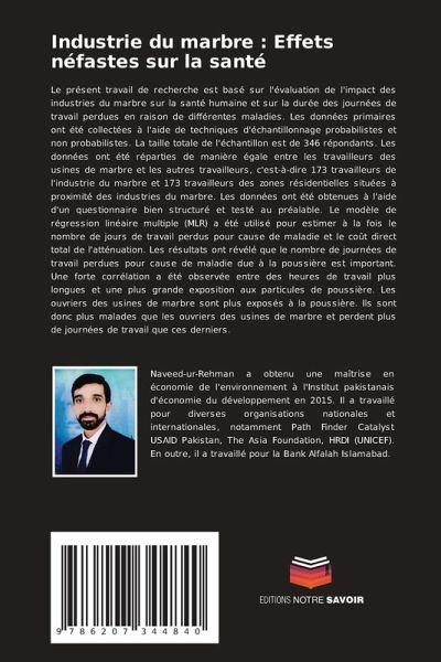 Le présent travail de recherche est basé sur l'évaluation de l'impact des industries du marbre sur la santé humaine et sur la durée des journées de travail perdues en raison de différentes maladies. Les données primaires ont été collectées à l'aide de techniques d'échantillonnage probabilistes et non probabilistes. La taille totale de l'échantillon est de 346 répondants. Les données ont été réparties de manière égale entre les travailleurs des usines de marbre et les autres travailleurs, c'est-à-dire 173 travailleurs de l'industrie du marbre et 173 travailleurs des zones résidentielles situées à proximité des industries du marbre. Les données ont été obtenues à l'aide d'un questionnaire bien structuré et testé au préalable. Le modèle de régression linéaire multiple (MLR) a été utilisé pour estimer à la fois le nombre de jours de travail perdus pour cause de maladie et le coût direct total de l'atténuation. Les résultats ont révélé que le nombre de journées de travail perdues pour cause de maladie due à la poussière est important. Une forte corrélation a été observée entre des heures de travail plus longues et une plus grande exposition aux particules de poussière. Les ouvriers des usines de marbre sont plus exposés à la poussière. Ils sont donc plus malades que les ouvriers des usines de marbre et perdent plus de journées de travail que ces derniers.
