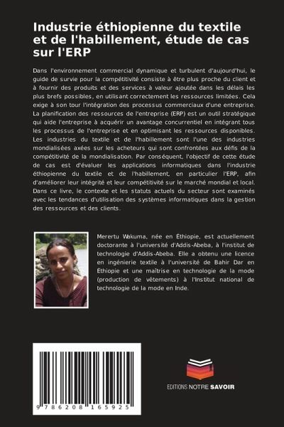 Dans l'environnement commercial dynamique et turbulent d'aujourd'hui, le guide de survie pour la compétitivité consiste à être plus proche du client et à fournir des produits et des services à valeur ajoutée dans les délais les plus brefs possibles, en utilisant correctement les ressources limitées. Cela exige à son tour l'intégration des processus commerciaux d'une entreprise. La planification des ressources de l'entreprise (ERP) est un outil stratégique qui aide l'entreprise à acquérir un avantage concurrentiel en intégrant tous les processus de l'entreprise et en optimisant les ressources disponibles. Les industries du textile et de l'habillement sont l'une des industries mondialisées axées sur les acheteurs qui sont confrontées aux défis de la compétitivité de la mondialisation. Par conséquent, l'objectif de cette étude de cas est d'évaluer les applications informatiques dans l'industrie éthiopienne du textile et de l'habillement, en particulier l'ERP, afin d'améliorer leur intégrité et leur compétitivité sur le marché mondial et local. Dans ce livre, le contexte et les statuts actuels du secteur sont examinés avec les tendances d'utilisation des systèmes informatiques dans la gestion des ressources et des clients.