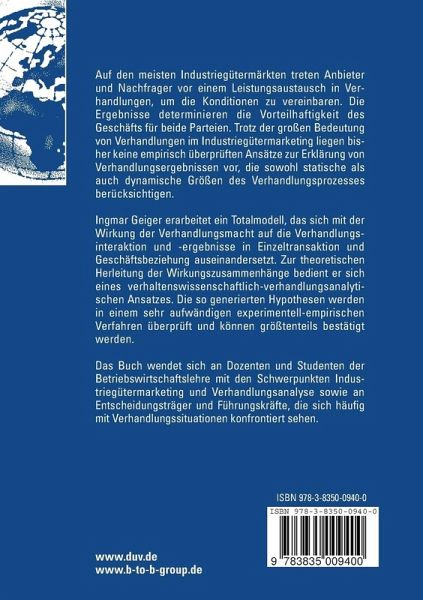 Ingmar Geiger erarbeitet ein Totalmodell, das sich mit der Wirkung der Verhandlungsmacht auf die Verhandlungsinteraktion und -ergebnisse in Einzeltransaktion und Geschäftsbeziehung auseinandersetzt. Zur theoretischen Herleitung der Wirkungszusammenhänge bedient er sich eines verhaltenswissenschaftlich- verhandlungsanalytischen Ansatzes. Die so generierten Hypothesen werden in einem sehr aufwändigen experimentell-empirischen Verfahren überprüft und können größtenteils bestätigt werden.