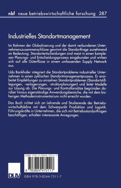 Udo Bankhofer integriert die Standortprobleme industrieller Unternehmen in einen zyklischen Standortmanagementprozess. Er erarbeitet Empfehlungen zu einzelnen Standortproblemen (Standortstilllegungen, -verlagerungen, strukturplanungen) und leitet Modelle zur Lösung ab.