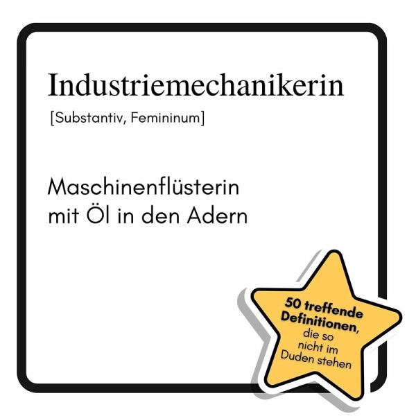 Wenn Maschinen sprechen könnten, würden sie sie beim Namen nennen: "Industriemechanikerin: Maschinenflüsterin mit Öl in den Adern" ist das Buch, das zeigt, wie viel Witz, Können und Herzblut in einem der wichtigsten Berufe der Industrie steckt. 50 Werkzeuge, Maschinen und Situationen - von Drehmomentschlüssel bis Endmontageband - werden mit einer Prise Humor und einer passenden Illustration neu definiert.Für wen dieses Buch perfekt ist:- Für alle, die den Alltag in der Werkstatt lieben oder kennenlernen wollen- Für Technikbegeisterte mit Sinn für Humor- Für alle, die ein originelles Geschenk für Mechanik-Fans suchenOb als Geschenk, für die eigene Sammlung oder als Motivation im Arbeitsalltag: Dieses Buch bringt die Welt der Industriemechanikerin auf den Punkt - mit einem Augenzwinkern und jeder Menge Öl im Getriebe.Was dieses Buch bietet:- 50 witzige Definitionen rund um den Beruf Industriemechanikerin- Passende Illustrationen zu jedem Begriff- Einblicke in Werkstatt, Maschinenpark und Teamgeist- Perfekt für Fans von Technik und Humor