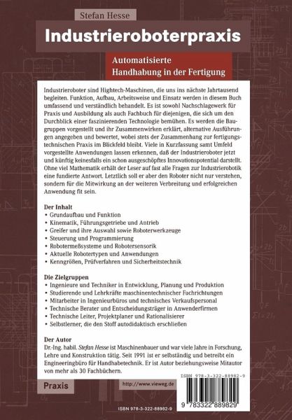 Immer öfter sind Industrieroboter in den unterschiedlichsten Anwendungsbereichen zu finden. Robotertechnik ist zu einer modernen Basistechnologie geworden, für die sich immer mehr Menschen interessieren. Das Buch gibt einen umfassenden Überblick über die Technik des Industrieroboters, seine Baugruppen, die Bauweisen, Steuerung und Programmierung sowie seine Funktion. Die Vielfalt der dargestellten Möglichkeiten erleichtert dem Leser die Suche nach Lösungsvorschlägen und Argumenten für eine bestimmte Realisierung. Knapper Text und reichhaltige Darstellungen kommen einer rationellen Auswertung und Arbeit mit dem Buch entgegen.