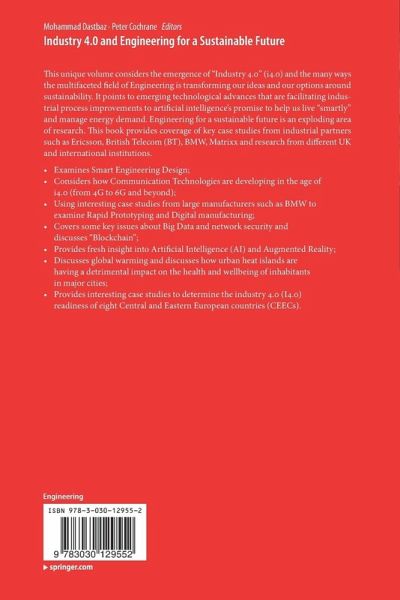 This unique volume considers the emergence of "Industry 4.0" (i4.0) and the many ways the multifaceted field of Engineering is transforming our ideas and our options around sustainability. It points to emerging technological advances that are facilitating industrial process improvements to artificial intelligence's promise to help us live "smartly" and manage energy demand. Engineering for a sustainable future is an exploding area of research. This book provides coverage of key case studies from industrial partners such as Ericsson, British Telecom (BT), BMW, Matrixx and research from different UK and international institutions.