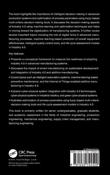 The book highlights the importance of intelligent decision-making in advanced production systems, and optimization of process parameters using fuzzy-based multi-criteria decision-making tools. It discusses the decision-making aspects of Industry 4.0 using machine learning and optimization techniques and helps in moving toward the digitalization of manufacturing systems. It further covers several important topics including the role of digital twins in advanced manufacturing processes, machine learning-based prediction of overall equipment effectiveness, intelligent quality control tools, and life cycle assessment models in Industry 4.0.