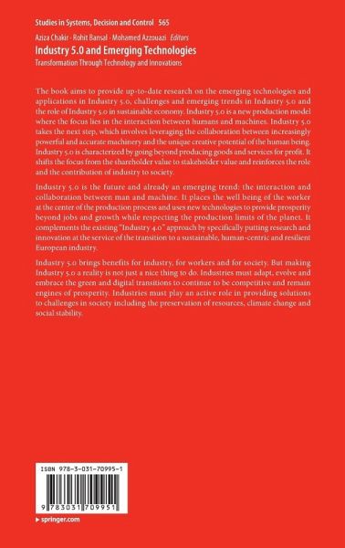 The book aims to provide up-to-date research on the emerging technologies and applications in Industry 5.0, challenges and emerging trends in Industry 5.0 and the role of Industry 5.0 in sustainable economy. Industry 5.0 is a new production model where the focus lies in the interaction between humans and machines. Industry 5.0 takes the next step, which involves leveraging the collaboration between increasingly powerful and accurate machinery and the unique creative potential of the human being. Industry 5.0 is characterized by going beyond producing goods and services for profit. It shifts the focus from the shareholder value to stakeholder value and reinforces the role and the contribution of industry to society.