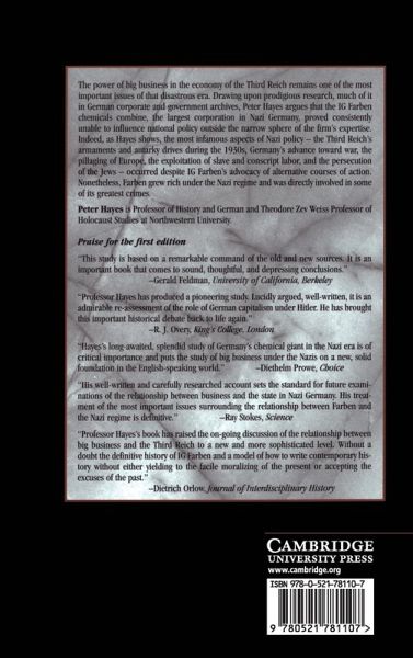 The power of big business in the economy of the Third Reich remains one of the most important issues of that era. Drawing upon research, much of it in German corporate and government archives, Peter Hayes argues that IG Farben Chemicals, the largest corporation in Nazi Germany, proved consistently unable to influence national policy outside the narrow sphere of the firm's expertise. Indeed, as Hayes shows, the most infamous aspects of Nazi policy - the Third Reich's armaments and autarky drives during the 1930s, Germany's advance toward war, the pillaging of Europe, the exploitation of slave and conscript labor, and the persecution of the Jews - occurred despite IG Farben's advocacy of alternative courses of action. Nonetheless, Farben grew rich under the Nazi regime and was directly involved in some of its greatest crimes.