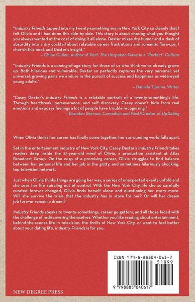 When Olivia thinks her career has finally come together, her surrounding world falls apart. Set in the entertainment industry of New York City, Casey Dexter's Industry Friends takes readers deep inside the 25-year-old mind of Olivia, a production assistant at Atlas Broadcast Group. On the cusp of a promising career, Olivia struggles to find balance between her personal life and her job in the gritty, and sometimes hilariously shocking, top television network. Just when Olivia thinks things are going her way, a series of unexpected events unfold and she sees her life spiraling out of control. With the New York City life she so carefully curated forever changed, Olivia finds herself alone and questioning her every move. Will she survive the trials that the industry has in store for her? Or will her dream job forever remain a dream? Industry Friends speaks to twenty-somethings, career go-getters, and all those faced with the challenge of rediscovering themselves. Whether you like reading about entertainment, behind-the-scenes life in television, the thrills of New York City, or want to feel better about your dating life, Industry Friends is for you.