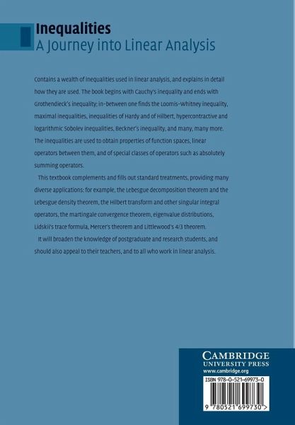 Contains a wealth of inequalities used in linear analysis, and explains in detail how they are used. The book begins with Cauchy's inequality and ends with Grothendieck's inequality, in between one finds the Loomis-Whitney inequality, maximal inequalities, inequalities of Hardy and of Hilbert, hypercontractive and logarithmic Sobolev inequalities, Beckner's inequality, and many, many more. The inequalities are used to obtain properties of function spaces, linear operators between them, and of special classes of operators such as absolutely summing operators. This textbook complements and fills out standard treatments, providing many diverse applications: for example, the Lebesgue decomposition theorem and the Lebesgue density theorem, the Hilbert transform and other singular integral operators, the martingale convergence theorem, eigenvalue distributions, Lidskii's trace formula, Mercer's theorem and Littlewood's 4/3 theorem. It will broaden the knowledge of postgraduate and research students, and should also appeal to their teachers, and all who work in linear analysis.