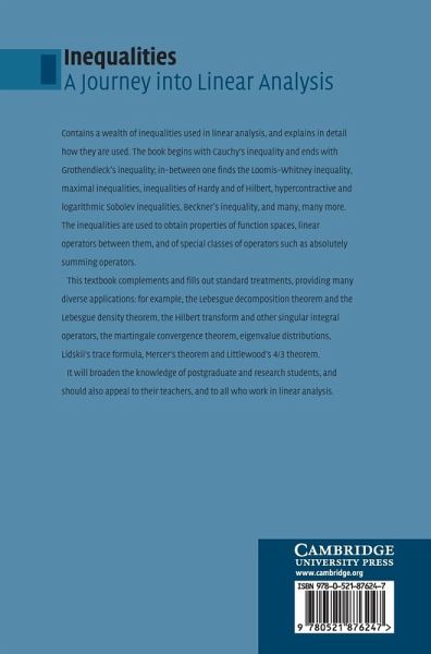 Contains a wealth of inequalities used in linear analysis, and explains in detail how they are used. The book begins with Cauchy's inequality and ends with Grothendieck's inequality, in between one finds the Loomis-Whitney inequality, maximal inequalities, inequalities of Hardy and of Hilbert, hypercontractive and logarithmic Sobolev inequalities, Beckner's inequality, and many, many more. The inequalities are used to obtain properties of function spaces, linear operators between them, and of special classes of operators such as absolutely summing operators. This textbook complements and fills out standard treatments, providing many diverse applications: for example, the Lebesgue decomposition theorem and the Lebesgue density theorem, the Hilbert transform and other singular integral operators, the martingale convergence theorem, eigenvalue distributions, Lidskii's trace formula, Mercer's theorem and Littlewood's 4/3 theorem. It will broaden the knowledge of postgraduate and research students, and should also appeal to their teachers, and all who work in linear analysis.