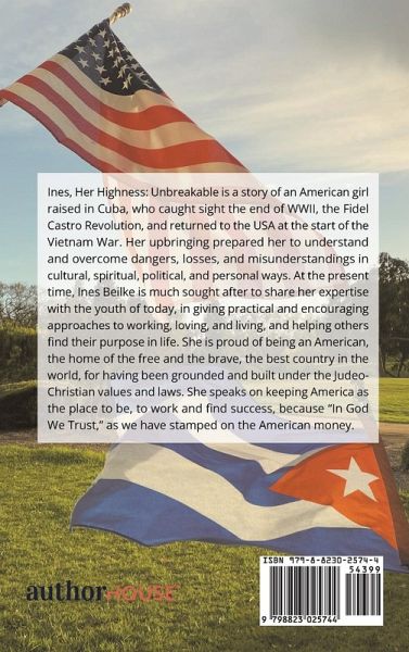 Ines, Her Highness: Unbreakable is a story of an American girl raised in Cuba, who caught sight the end of WWII, the Fidel Castro Revolution, and returned to the USA at the start of the Vietnam War. Her upbringing prepared her to understand and overcome dangers, losses, and misunderstandings in cultural, spiritual, political, and personal ways. At the present time, Ines Beilke is much sought after to share her expertise with the youth of today, in giving practical and encouraging approaches to working, loving, and living, and helping others find their purpose in life. She is proud of being an American, the home of the free and the brave, the best country in the world, for having been grounded and built under the Judeo-Christian values and laws. She speaks on keeping America as the place to be, to work and find success, because "In God We Trust," as we have stamped on the American money.