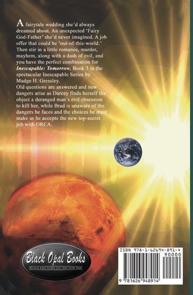 A fairytale wedding she'd always dreamed about. An unexpected "Fairy God-Father" she'd never imagined. A grandmother she'd never known. Add a deranged uncle obsessed with revenge. An impending crisis as the earth's ozone layer diminishes, which leads to a job offer for Brad that could be "out of this world." Then stir in a little romance, murder, mayhem, along with a dash of evil, and you have the perfect combination for Inescapable ~ Tomorrow, Book 3 in the spectacular Inescapable Series by Madge H. Gressley. Old questions are answered, and new dangers arise as Darcey finds herself the object an evil plot of revenge on Brad, who is unaware of the dangers he faces and the choices he must make as he accepts the new top-secret job with ORCA.