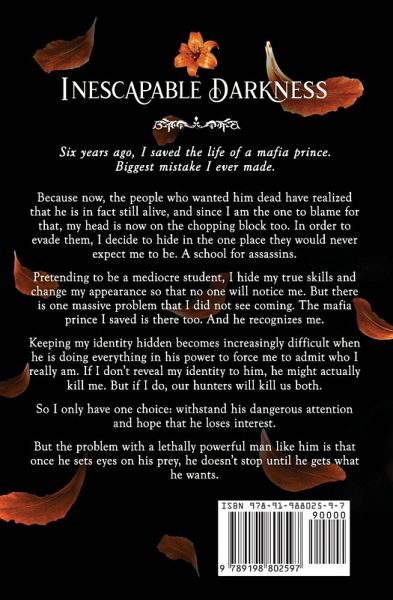 Six years ago, I saved the life of a mafia prince. Biggest mistake I ever made. Because now, the people who wanted him dead have realized that he is in fact still alive, and since I am the one to blame for that, my head is now on the chopping block too. In order to evade them, I decide to hide in the one place they would never expect me to be. A school for assassins. Pretending to be a mediocre student, I hide my true skills and change my appearance so that no one will notice me. But there is one massive problem that I did not see coming. The mafia prince I saved is there too. And he recognizes me. Keeping my identity hidden becomes increasingly difficult when he is doing everything in his power to force me to admit who I really am. If I don't reveal my identity to him, he might actually kill me. But if I do, our hunters will kill us both. So I only have one choice: withstand his dangerous attention and hope that he loses interest. But the problem with a lethally powerful man like him is that once he sets eyes on his prey, he doesn't stop until he gets what he wants.