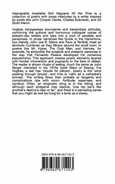 Inescapable Insatiable Shit Happens All the Time is a collection of poetry with prose interludes by a writer inspired by poets like John Cooper Clarke, Charles Bukowski, and Gil Scott-Heron. Hughes transgresses boundaries and bastardizes attitudes, combining the guttural and humorous colloquial voices of present-day streets and bars into a knot of parallels and paradoxes. In prose narratives like Guide to the Hamartons, two friends, John Joe B. Albino and Pavo la Terriblé, meet an alcoholic Cumbrian as they flâneur around the small town. In poems like Mr. Hyper, The Coal Man, and Hermes, for example, he embodies the subjects and presents personae in the way that Fernando Pessoa developed his numerous pseudonyms. This approach creates poetic elements layered with honest introversion and pugnacity in the face of defeat. The reader is shown rituals of seeing, much the same as John Berger intimated in his 1970s book Ways of Seeing. For Hughes, a leaf has 'clouds for pillows', poetry is the 'wind passing through fences', and time is 'calm as a cathedral's echoes'. The writing flows then pinballs at tangents and complications ripe with scorn, fortitude, sassiness, and candour. Often, an enigmatic sting is in the telling, and although each endgame may resolve, 'one hip bar's like another's destiny's near or far', and there is a pervading sense that you might as well be hung for a lamb as a sheep.
