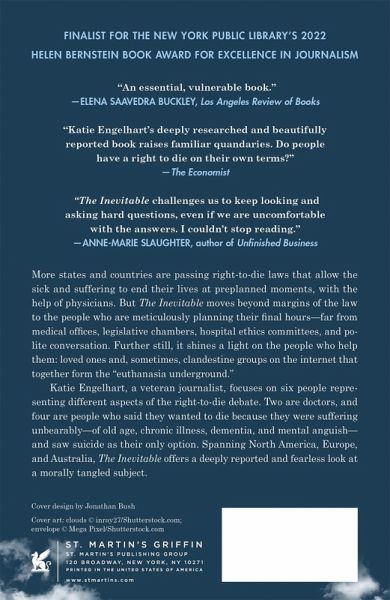 A riveting, incisive, and wide-ranging book about the Right to Die movement, and the doctors, patients, and activists at the heart of this increasingly urgent issue. *Finalist for the New York Public Library's 2022 Helen Bernstein Book Award for Excellence in Journalism "A remarkably nuanced, empathetic, and well-crafted work of journalism."-Brooke Jarvis, The New Yorker More states and countries are passing right-to-die laws that allow the sick and suffering to end their lives at pre-planned moments, with the help of physicians. But The Inevitable moves beyond margins of the law to the people who are meticulously planning their final hours-far from medical offices, legislative chambers, hospital ethics committees, and polite conversation. Further still, it shines a light on the people who help them: loved ones and, sometimes, clandestine groups on the Internet that together form the "euthanasia underground." Katie Engelhart, a veteran journalist, focuses on six people representing different aspects of the right to die debate. Two are doctors: a California physician who runs a boutique assisted death clinic and has written more lethal prescriptions than anyone else in the U.S.; an Australian named Philip Nitschke who lost his medical license for teaching people how to end their lives painlessly and peacefully at "DIY Death" workshops. The other four chapters belong to people who said they wanted to die because they were suffering unbearably-of old age, chronic illness, dementia, and mental anguish-and saw suicide as their only option. Spanning North America, Europe, and Australia, The Inevitable offers a deeply reported and fearless look at a morally tangled subject. It introduces readers to ordinary people who are fighting to find dignity and authenticity in the final hours of their lives.