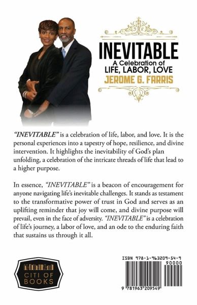 "INEVITABLE" is a celebration of life, labor, and love. It is the personal experiences into a tapestry of hope, resilience, and divine intervention. It highlights the inevitability of God's plan unfolding, a celebration of the intricate threads of life that lead to a higher purpose. In essence, "INEVITABLE" is a beacon of encouragement for anyone navigating life's inevitable challenges. It stands as testament to the transformative power of trust in God and serves as an uplifting reminder that joy will come, and divine purpose will prevail, even in the face of adversity. "INEVITABLE" is a celebration of life's journey, a labor of love, and an ode to the enduring faith that sustains us through it all.