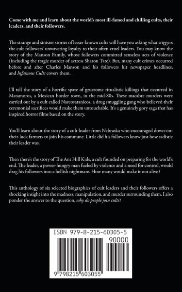Come with me and learn about the world's most ill-famed and chilling cults, their leaders, and their followers. The strange and sinister stories of lesser-known cults will have you asking what triggers the cult followers' unwavering loyalty to their often cruel leaders. You may know the story of the Manson Family, whose followers committed senseless acts of violence (including the tragic murder of actress Sharon Tate). But, many cult crimes occurred before and after Charles Manson and his followers hit newspaper headlines, and Infamous Cults covers them. I'll tell the story of a horrific spate of gruesome ritualistic killings that occurred in Matamoros, a Mexican border town, in the mid-80s. These macabre murders were carried out by a cult called Narcosatanicos, a drug smuggling gang who believed their ceremonial sacrifices would make them untouchable. It's a genuinely gory saga that has inspired horror films based on the story. You'll learn about the story of a cult leader from Nebraska who encouraged down-on-their-luck farmers to join his commune. Little did his followers know just how sadistic their leader was. Then there's the story of The Ant Hill Kids, a cult founded on preparing for the world's end. The leader, a power-hungry man fueled by violence and a need for control, would drag his followers into a hellish nightmare. How many would make it out alive? This anthology of six selected biographies of cult leaders and their followers offers a shocking insight into the madness, manipulation, and murder surrounding them. I also ponder the answer to the question, why do people join cults?