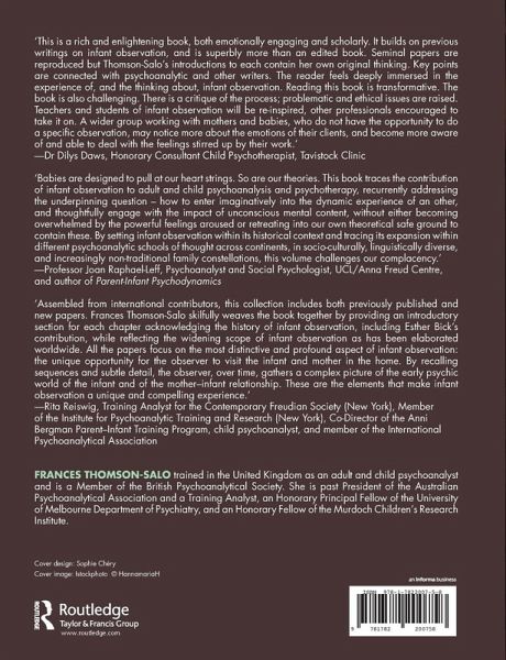 Infant Observation , Introduction to infant observation: an infant's inner world , Infant observation in psycho-analytic training , Three years infant observation with Esther Bick , A feeding observation: from breast to finger food! , Significant Developments of Infant Observation as a Method within Psychoanalytic Training , The dangers and deprivations of too-good mothering , Premature twins on a neonatal intensive care unit , A therapeutic application of infant observation in child psychiatry 1 , Research in Infant Observation , The shadow of ending: a retrospective qualitative research study of mothers' experience of infant observation , Problematic Aspects of Infant Observation , On-going physical trauma in an infant observation , The mother-observer relationship: an examination of the participant role of the observer in mother-infant observation , Maternal disavowal in the face of abuse of an infant by her sibling , Developments of the Infant Observation Model , Multiple mothering in an Indian context , Representations of mother in the daughter of a single, gay father , Struggling with cultural prejudice while observing babies: socio-centric and egocentric positions , Afterword
