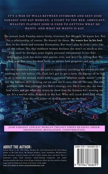 It's a war of wills between stubborn and sexy Josh Faraday and Kat Morgan. A fight to the bed. Arrogant, wealthy playboy Josh is used to getting what he wants. And what he wants is Kat Morgan. The minute Josh Faraday meets feisty, vivacious Kat Morgan, he wants her. Not for a relationship, of course. He doesn't do those. He wants her in his bed. But, to his shock and extreme frustration, Kat won't play by Josh's rules like all the others. No, this stubborn woman declares she won't so much as kiss Josh until he divulges some highly personal information.... But it's something Josh has never told anyone, and won't be telling Kat. Not over his dead body, no matter how gorgeous and sexy she is. But the chemistry between the pair is explosive, scorching hot electricity like nothing he's felt before. Oh, God, he's got to get a taste. He figures all he has to do is wear the sexy woman down with is patented "playboy razzle dazzle"-show her the hotness she's missing out on and she'll cave, like all the rest... The only problem with that strategy? It's Kat's strategy, too: she plans to wear Josh down and get what she wants too. It's a war of wills. A match to the bed. Who will crack first? And when they do, will either of their hearts be on the line? INFATUATION is first book of the JOSH AND KAT TRILOGY. The next two books are REVELATION and CONSUMMATION, to be read in order. INFATUATION is set in the same world as THE CLUB TRILOGY and THE MORGAN BROTHERS SERIES, but you do not have to read either series first to devour this white-hot love story about Josh Faraday and Kat Morgan.