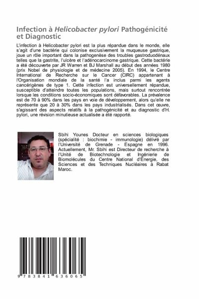 L'infection à Helicobacter pylori est la plus répandue dans le monde, elle s'agit d'une bactérie qui colonise exclusivement la muqueuse gastrique, joue un rôle important dans la pathogenèse des troubles gastroduodénaux telles que la gastrite, l'ulcère et l'adénocarcinome gastrique. Cette bactérie a été découverte par JR Warren et BJ Marshall au début des années 1980 (prix Nobel de physiologie et de médecine 2005). En 1994, le Centre International de Recherche sur le Cancer (CIRC) appartenant à l'Organisation mondiale de la santé l'a inclus parmi les agents cancérigènes de type 1. Cette infection est universellement répandue, susceptible d'atteindre toutes les populations, mais surtout rencontrée lorsque les conditions socio-économiques sont défavorables. La prévalence est de 70 à 90% dans les pays en voie de développement, alors qu'elle ne représente que 20 à 30% dans les pays industrialisés. Dans cet oeuvre, s'agissant des aspects relatifs à la pathogénicité et au diagnostic d'H. pylori, une révision minutieuse actualisée a été rapporté.