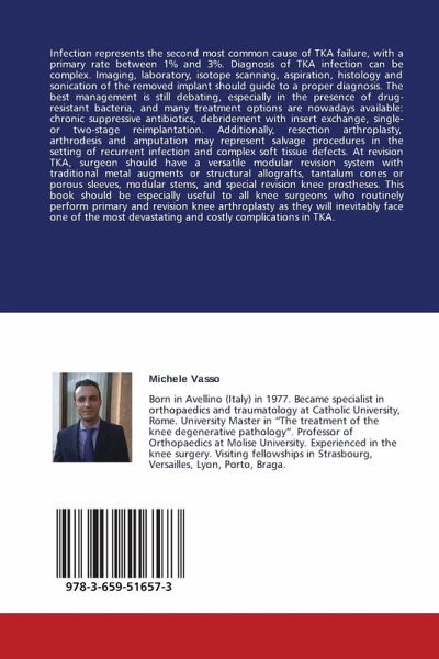 Infection represents the second most common cause of TKA failure, with a primary rate between 1% and 3%. Diagnosis of TKA infection can be complex. Imaging, laboratory, isotope scanning, aspiration, histology and sonication of the removed implant should guide to a proper diagnosis. The best management is still debating, especially in the presence of drug-resistant bacteria, and many treatment options are nowadays available: chronic suppressive antibiotics, debridement with insert exchange, single- or two-stage reimplantation. Additionally, resection arthroplasty, arthrodesis and amputation may represent salvage procedures in the setting of recurrent infection and complex soft tissue defects. At revision TKA, surgeon should have a versatile modular revision system with traditional metal augments or structural allografts, tantalum cones or porous sleeves, modular stems, and special revision knee prostheses. This book should be especially useful to all knee surgeons who routinely perform primary and revision knee arthroplasty as they will inevitably face one of the most devastating and costly complications in TKA.