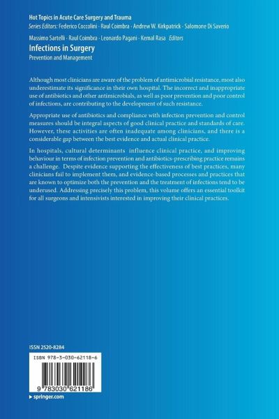 1 Impact of hospital-acquired infections in Surgery.- 2 The burden of surgical site infections. Pathophysiology and risk factors. Pre-operative measures to prevent surgical site infections.- 3 Antibiotic prophylaxis. When, how and how long.- 4 Intra-operative measures to prevent surgical site infections.- 5 How to manage the surgical wound.- 6 How to classify and treat surgical site infections.- 7 Guidelines for the prevention of surgical site infections. How to implement them.- 8 The infected mesh. How to treat it.- 9 How to prevent and treat hospital/ventilator-acquired pneumonia.- 10 How to prevent and treat hospital/ventilator-acquired pneumonia.- 11 How to prevent and treat catheter-associated urinary Tract Infections.- 12 How to prevent and treat Catheter-related bloodstream infections.- 13 Clostridium difficile infection in surgical patients.- 14 Source control in intra-abdominal infections.- 15 Ongoing (tertiary peritonitis) peritonitis.- 16 Damage Control Surgery in patients with acute peritonitis. When and how.- 17 The challenge of post-operative peritonitis by anastomotic leak.- 18 Antibiotics in intra-abdominal infections. When, how and which ones.- 19 Necrotizing soft tissue infections.- 20 Infections in elderly patients.- 21 How to use antibiotics in critically ill patients with sepsis and septic shock.- 22 Infections in trauma patients.- 23 The value of microbiological cultures. When to perform them and how to read them.- 24 Invasive candidiasis in surgical patients.- 25 The role of antimicrobial stewardship programs to optimize antibiotics use in the surgical departments.- 26 The impact of antimicrobial resistance. How can healthcare workers can contribute in the context of "one health approach"