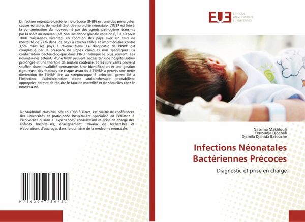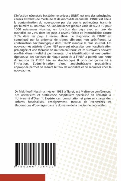 L'infection néonatale bactérienne précoce (INBP) est une des principales causes évitables de mortalité et de morbidité néonatale. L'INBP est liée à la contamination du nouveau-né par des agents pathogènes transmis par la mère au nouveau-né. Son incidence globale varie de 0,2 à 10 pour 1000 naissances vivantes, en fonction des pays avec un taux de mortalité de 27% dans les pays à revenu faible et intermédiaire contre 3,5% dans les pays à revenu élevé. Le diagnostic de l'INBP est compliqué par la présence de signes cliniques non spécifiques. La confirmation bactériologique dans l'INBP manque le plus souvent. Les nouveau-nés atteints d'une INBP peuvent nécessiter une hospitalisation prolongée et une thérapie de soutien coûteuse, et les survivants peuvent souffrir d'une invalidité permanente. Une identification et une gestion rigoureuse des facteurs de risque associés à l'INBP a permis une nette diminution de l'INBP liée au streptocoque B principal germe lié à l'infection. L'administration d'une antibiothérapie probabiliste appropriée permet de réduire le taux de mortalité et de séquelles chez le nouveau-né.