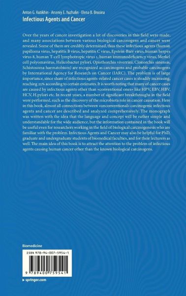 Over the years of cancer investigation a lot of discoveries in this field were made, and many associations between various biological carcinogens and cancer were revealed. Some of them are credibly determined, thus these infectious agents (human papilloma virus, hepatitis B virus, hepatitis C virus, Epstein-Barr virus, human herpes virus 8, human T-cell lymphotropic virus 1, human immunodeficiency virus, Merkel cell polyomavirus, Helicobacter pylori, Opisthorchis viverrini, Clonorchis sinensis, Schistosoma haematobium) are recognized as carcinogens and probable carcinogens by International Agency for Research on Cancer (IARC). The problem is of large importance, since share of infectious agents-related cancer cases is steadily increasing, reaching 25% according to certain estimates. It is worth noting that many of cancer cases are caused by infectious agents other than «conventional ones» like HPV, EBV, HBV, HCV, H.pylori etc. In recent years, a number of significant breakthroughs in the field were performed, such as the discovery of the microbiota role in cancer causation.